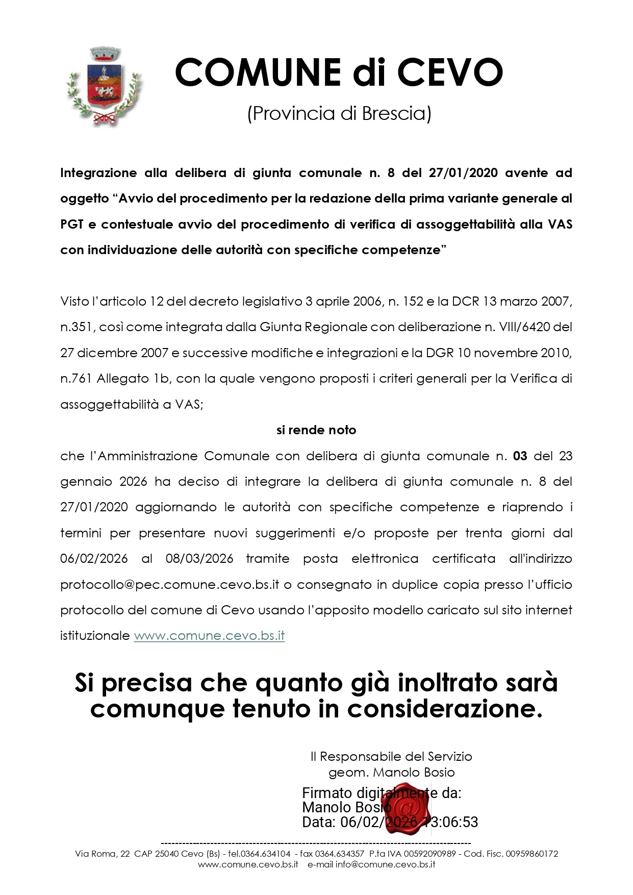 Si rende noto che l'amministrazione comunale con delibera di giunta comunale n.03 del 23 gennaio 2026 ha deciso di integrare la delibera di giunta comunale n.8 del 27/01/2020 aggiornando le autorità con specifiche competenze e riaprendo i termini per presentare nuovi suggerimenti e/o proposte per trenta giorni tramite posta elettronica certificata all'indirizzo protocollo@pec.comune.cevo,bs,it